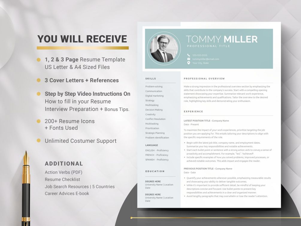 Carefully curated by experts in the field, this resume package guarantees to set you apart from other applicants. Say farewell to average resumes and embrace a modern and captivating layout that showcases your unique talents and accomplishments.